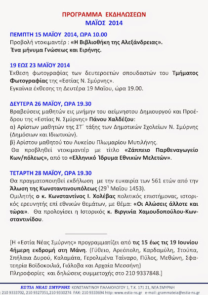 ΠΡΟΓΡΑΜΜΑ ΕΚΔΗΛΩΣΕΩΝ ΜΗΝΟΣ ΜΑΪΟΥ ΕΣΤΙΑΣ ΝΕΑΣ ΣΜΥΡΝΗΣ